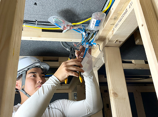 生活に欠かせない電気の仕組みや新しい技術を学びたいと思い、中学卒業後は工業高校の電気科へ進みました。高校には一条工務店以外にも有名なハウスメーカーの求人票が来ていましたが、就職先を選ぶ上で「どんな家を建てているか」を僕は重視していました。そして、性能や品質にこだわっている一条工務店が自分の考えに合っていると感じ、親も同じ意見だったので入社を決めました。実際に研修が始まってみると、楽しみにしていた通り、電気の裏側の仕組みを知ることができ「やりがいのある仕事だ」と日々実感しています。作業が終わるとブレーカーやスイッチのテストをしますが、正しく電気が流れると「自分の作業が間違っていなかった」と達成感も味わうことができます。まだ知らないことも多いのですが、いずれ後輩が入社して自分が先輩になったら今まで以上に自覚が求められ、さらに成長できると思うので楽しみです。