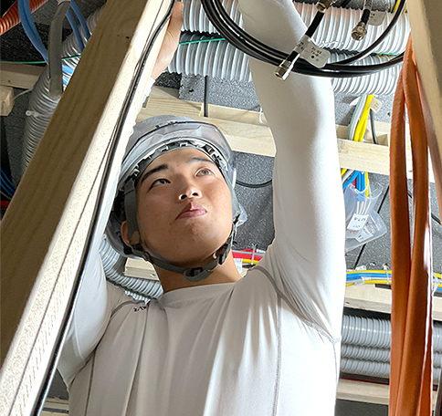 父も電気工事士で、子どもの時に引っ越した新居の電気工事を父が担当していました。その仕事の様子を僕も見る機会があり、中学3年生で進路を考える時に「父と同じ仕事がしたい」と思って電気工事士を目指しました。そのため就職先も一般住宅の電気工事ができる会社に絞って探し、担任の先生から勧められたのが一条工務店でした。性能を大切にしている会社なのでレベルの高い仕事ができると思い、「ここなら成長できそうだ」と迷いなく決めました。入社後は初めての一人暮らしで家事を覚えるのが大変でしたが、1か月ほどで慣れてきました。技術や知識については、事前に父の現場で少し勉強していましたが、やはり初めて知ることもたくさんあります。まだ一つひとつの作業が遅く、スピードも丁寧さも指導員の方とは比べ物になりませんが、施工した場所をきれいに仕上げるセンスも意識しながら地道に腕を磨いていきたいです。