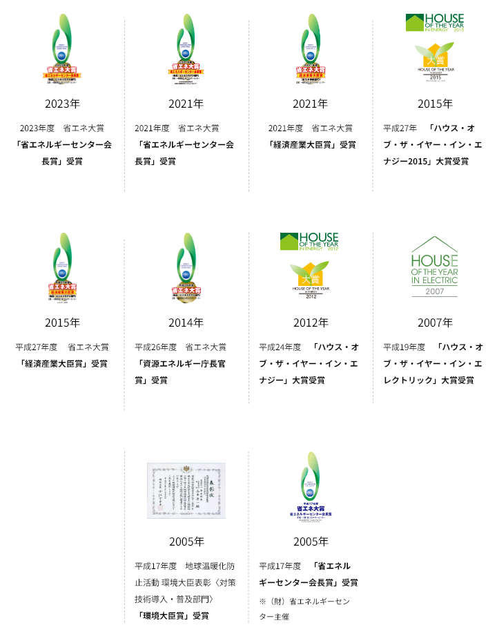 住宅業界の中でもいち早く省エネと環境保全に取り組んできました。その実績は社会的にも評価されており、建設業界で初めて、省エネ大賞「経済産業大臣賞」を住宅で受賞するなど、省エネ創エネに関するさまざまな受賞や認定につながっています。