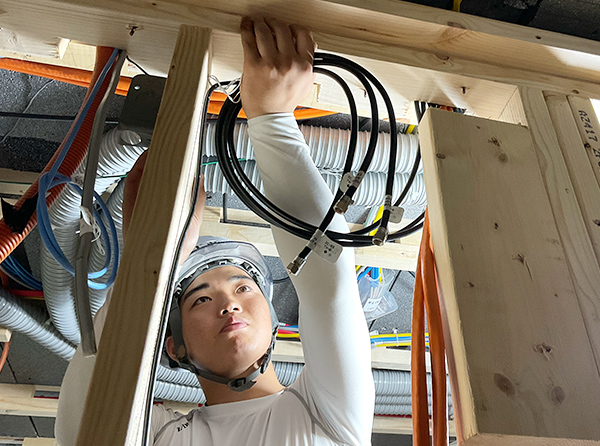 生活に欠かせない電気の仕組みや新しい技術を学びたいと思い、中学卒業後は工業高校の電気科へ進みました。高校には一条工務店以外にも有名なハウスメーカーの求人票が来ていましたが、就職先を選ぶ上で「どんな家を建てているか」を僕は重視していました。そして、性能や品質にこだわっている一条工務店が自分の考えに合っていると感じ、親も同じ意見だったので入社を決めました。実際に研修が始まってみると、楽しみにしていた通り、電気の裏側の仕組みを知ることができ「やりがいのある仕事だ」と日々実感しています。作業が終わるとブレーカーやスイッチのテストをしますが、正しく電気が流れると「自分の作業が間違っていなかった」と達成感も味わうことができます。まだ知らないことも多いのですが、いずれ後輩が入社して自分が先輩になったら今まで以上に自覚が求められ、さらに成長できると思うので楽しみです。