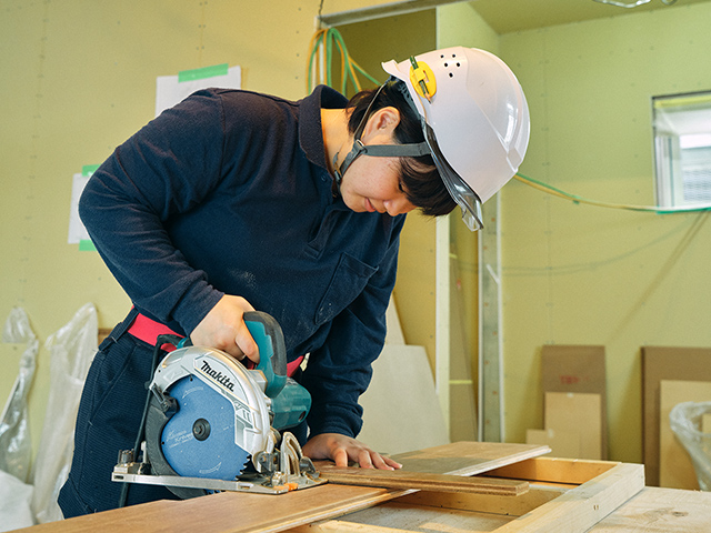 一条工務店で初めての女性大工として入社しましたが、いざ飛び込んでみたら「女性だから」という理由でハンディキャップになることは特にありませんでした。丸ノコなどの危険な工具も使いますが、安全講習がしっかりしているので安心でした。だから男女の差は気にせず、興味があればぜひ挑戦してほしいと思います!