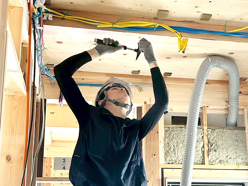 - A石膏ボードや造作材・住宅設備を持ったり運んだりするため、一定の体力は必要になります。ただ最近はさまざまな補助工具も市販されているので、体力が不安な方でも工夫しながら施工する事は可能です。一条工務店では女性でも大工として頑張っている社員もいます。多くの方が入社までの期間で少し体力をつける努力をされたり、集合研修中も就業後に同期と寮近くのジムに通ったりと、皆さん各々で体力・筋力アップに励まれています。仕事をしていると自ずと筋肉もついてくるので安心してください。