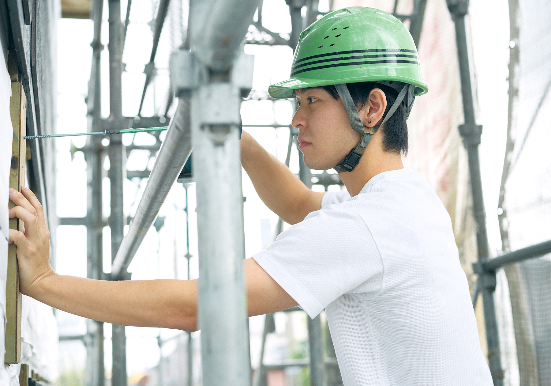 後輩に教えながらの現場作業。ビスの打ち方などの基本を教えた後、一緒に石膏ボードを貼ります。