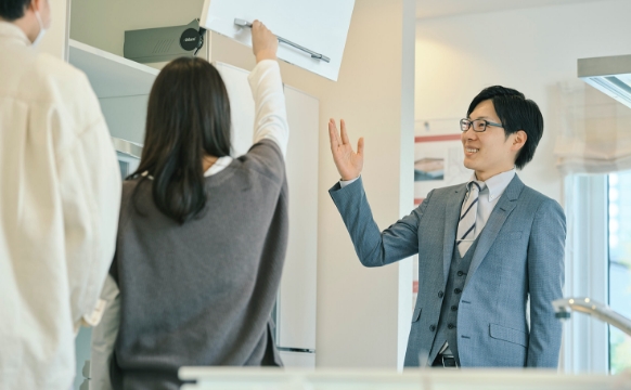 基本的な流れとしては、住宅展示場にお越しいただいて初回の商談を行います。その後、完成現場やすでにご入居されているお客様の家をご案内したり、一条の工場見学である「住まいの体験会」にご参加いただいたり。一条の家の性能を実感していただいた上で、お見積もりのご提示、プランのご提案というステップを踏みます。