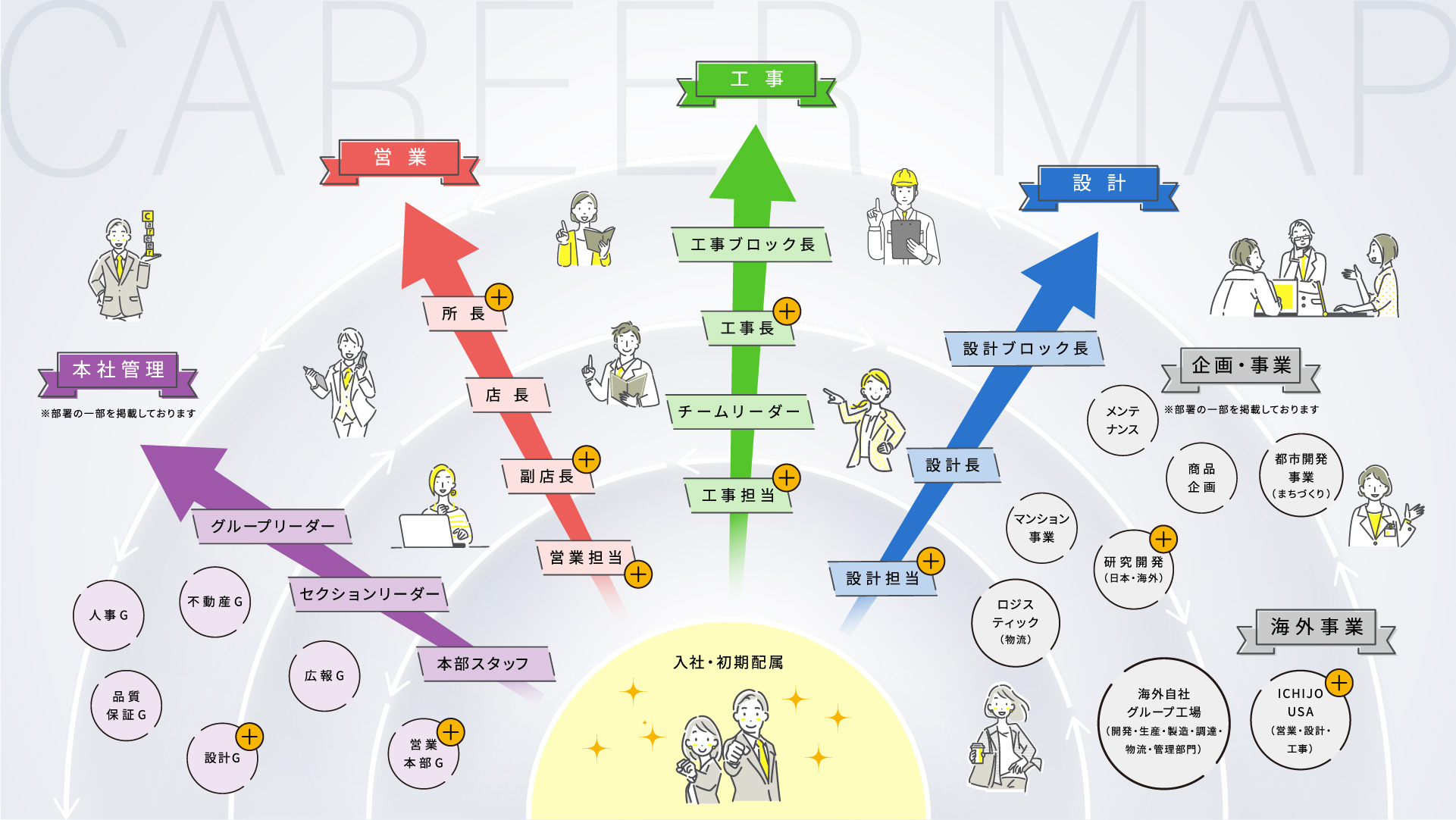 まずは営業・設計・工事でお客様の家づくりのサポート経験を経て、本社企画業務や商品開発業務、海外事業、関連事業など多岐にわたるキャリア形成を支援します。